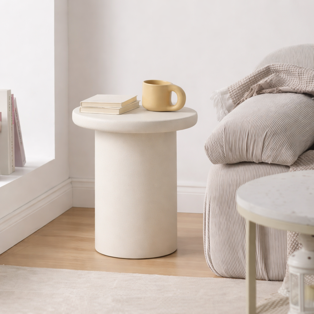 The Guadalajara microcement bedside table stands out with a resounding simplicity and a friendly presence. Its design, with pure cylindrical lines crowned by a rounded top, evokes the serene and firm architecture of Castilian arcades: structural elegance at the service of everyday life .