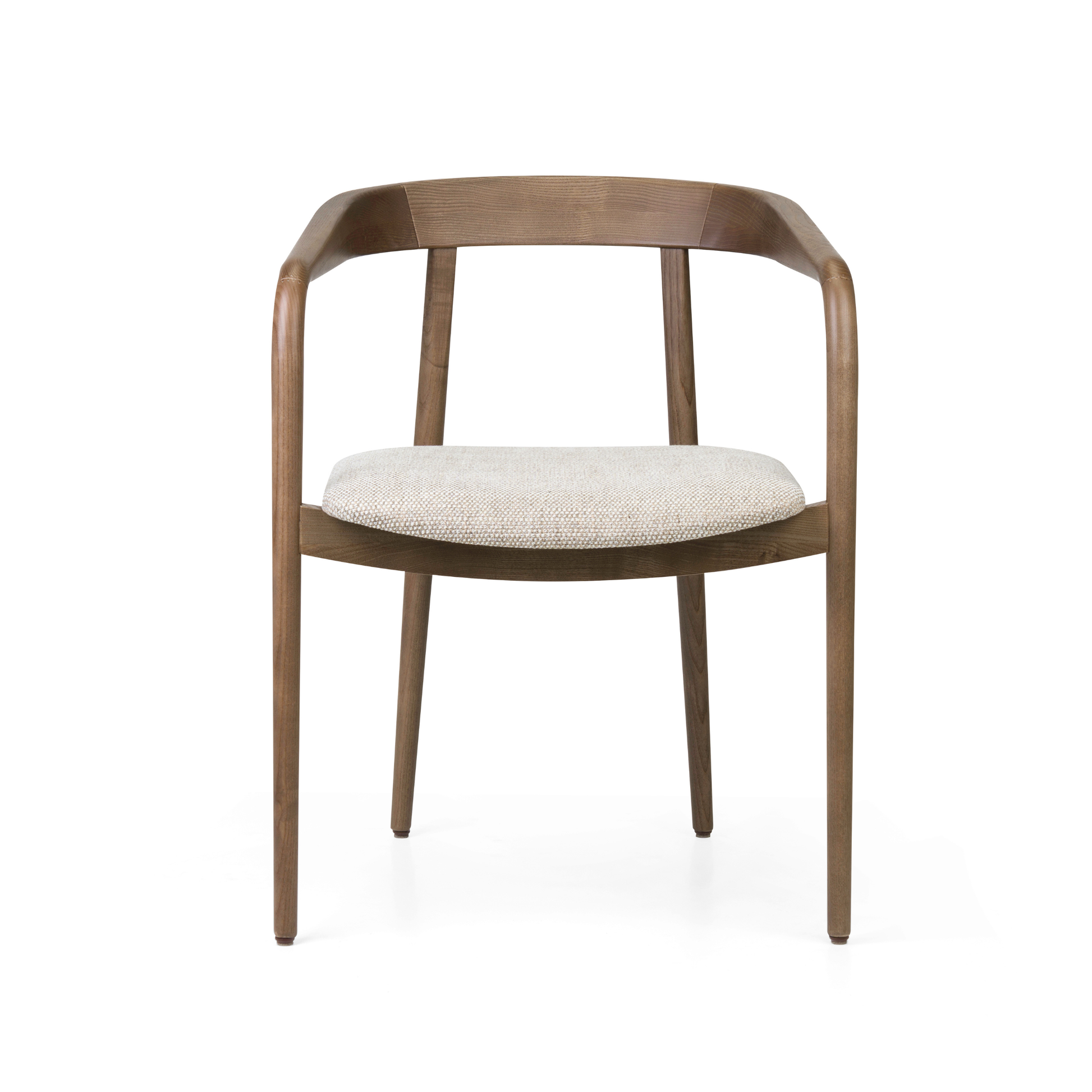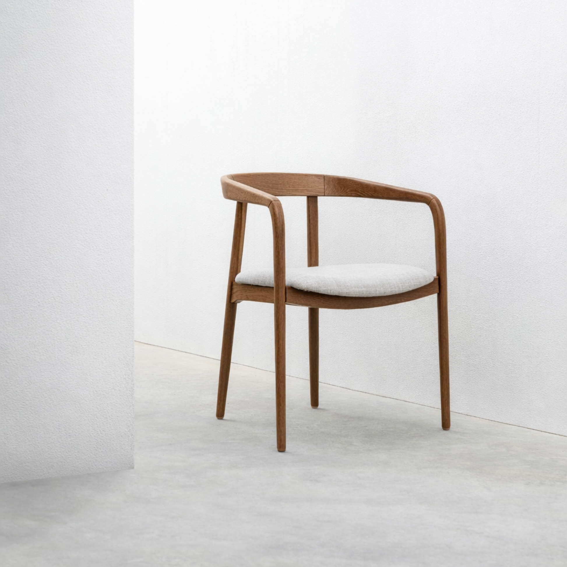 El respaldo envolvente y continuo aporta comodidad y carácter, mientras que el asiento tapizado suaviza el conjunto y eleva la experiencia de uso, haciendo de NUR una silla tan funcional como estética. Cada detalle está pensado para resaltar la belleza de la madera y mantener una imagen sobria, elegante y atemporal.
