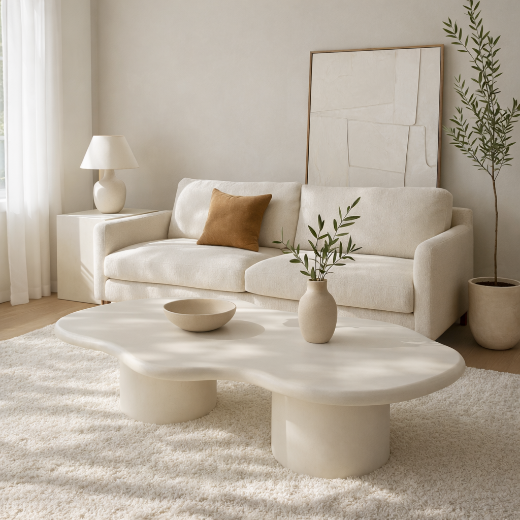 La mesa de centro de microcemento Comillas de Honara Homes es una pieza que habla en voz baja pero deja huella. Su silueta orgánica y sus líneas suaves evocan la calma de los paisajes naturales, convirtiéndose en un refugio visual en medio del salón.